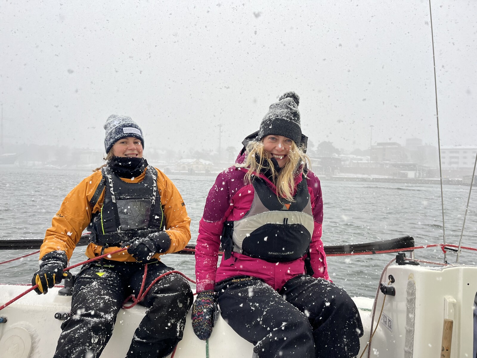 Gott humör, skratt och galenskap att segla i snöstorm håller energi och värme uppe. Foto: Karin Fernström