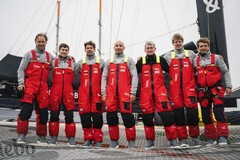 Besättningen ombord Sodebo Ultim 3 består av sju seglare; Thomas Coville, Frédéric Denis, Pierre Leboucher, Léonard Legrand, Guillaume Pirouelle, Benjamin Schwartz och Nicolas Troussel. Foto: Facebook @SodeboVoile