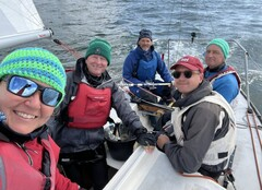 Glada miner ombord SWE4896 Team Front Runner efter första seglingsdagen. Foto: Team Front Runner