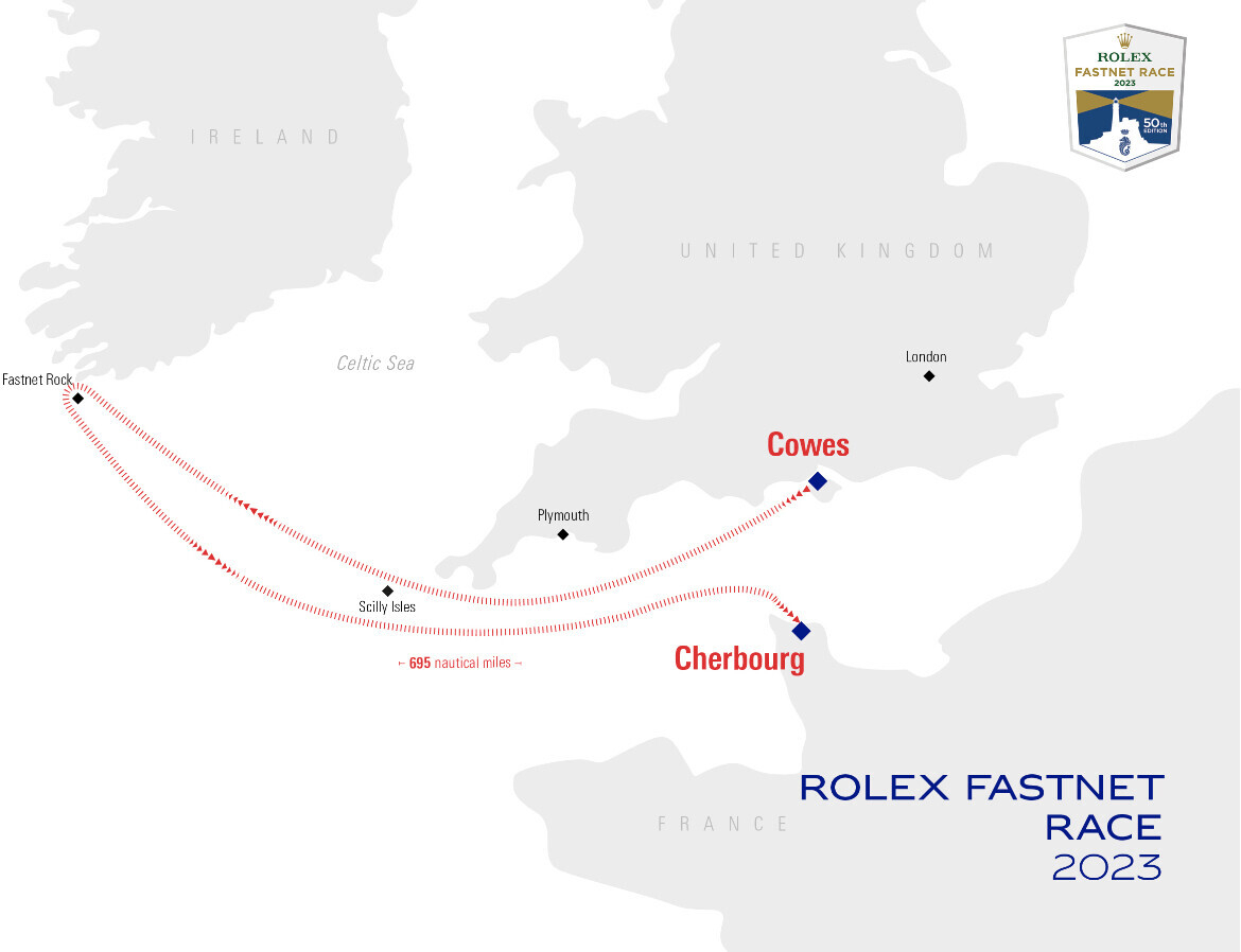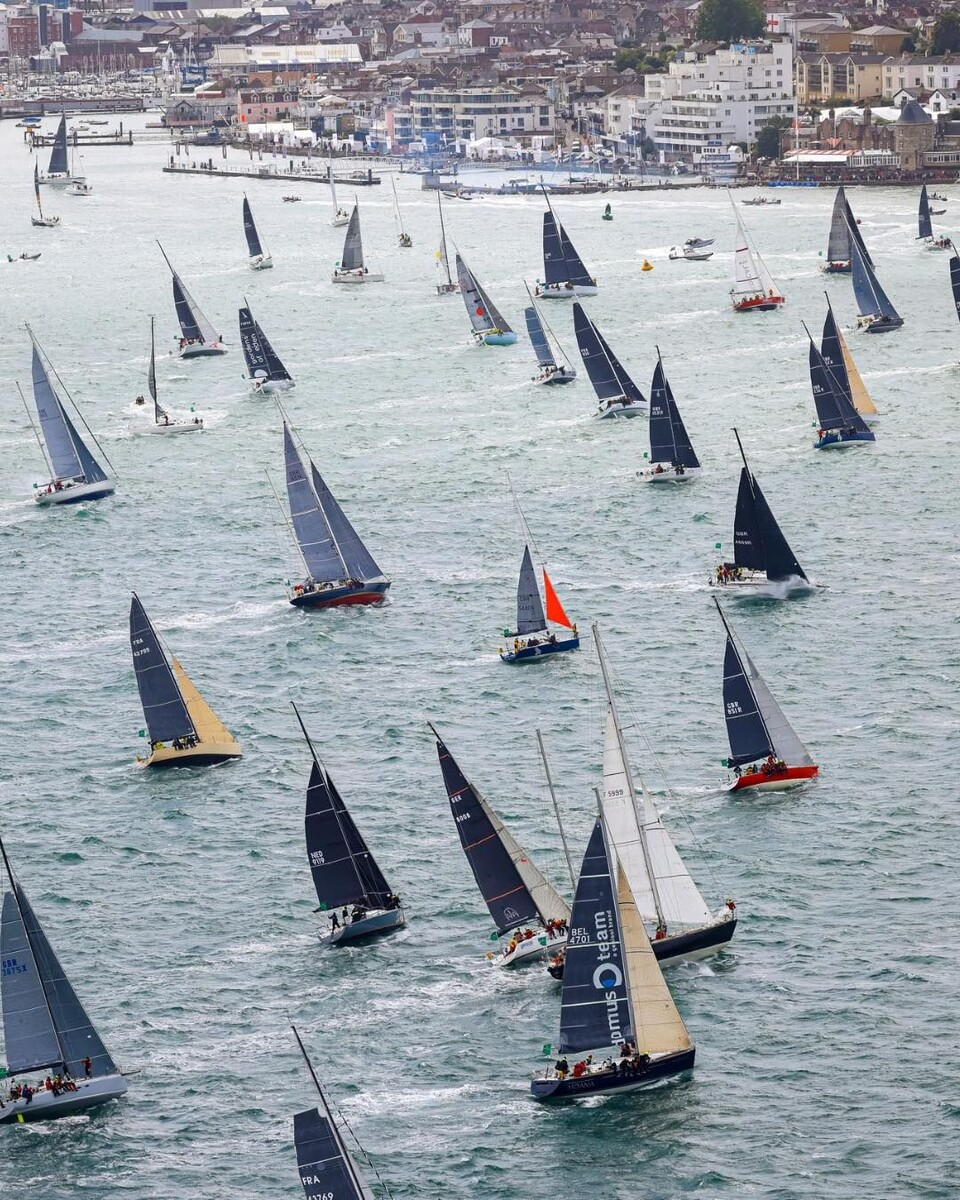 I ett grått Cowes startade idag den 50:e upplagan av Rolex Fastnet Race. Det rekordstora fleetet på 450 båtar ska nu segla den 695 sjömils banan från Cowes, Isle of Wight mot Cherbourg-en-Cotentin, Frankrike via Fastnet Rock utanför sydvästra Irland.