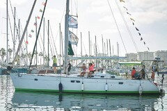 Linda Lindenau deltar med sin Peristera (här i Las Palmas inför starten) som enda båt med hel kvinnobesättning. Foto: Linda Lindenau