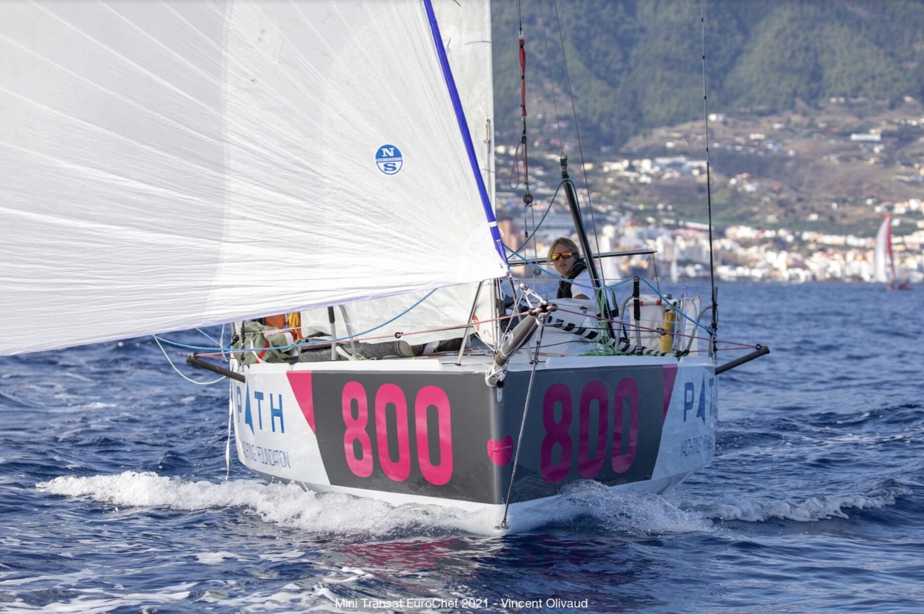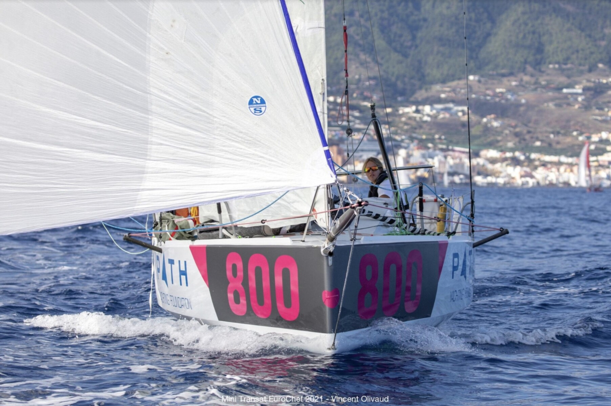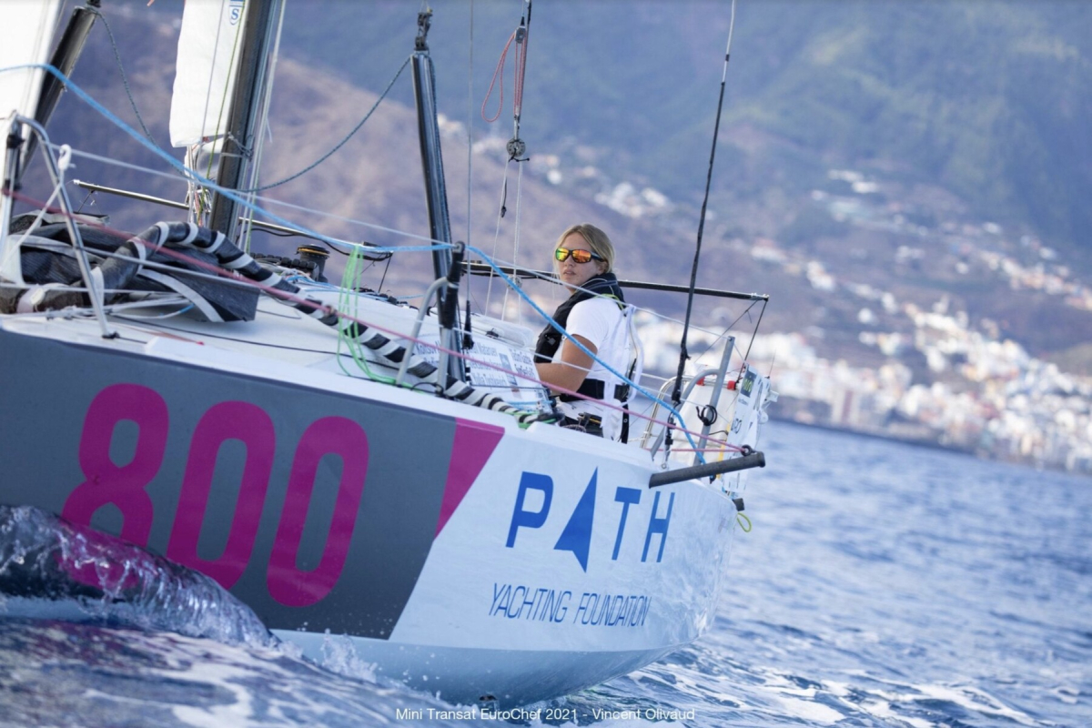 Irina Gracheva startar i vackert väder och lite lagom med vind. Foto: Mini Transat EuroChef 2021 / Vincent Olivaud