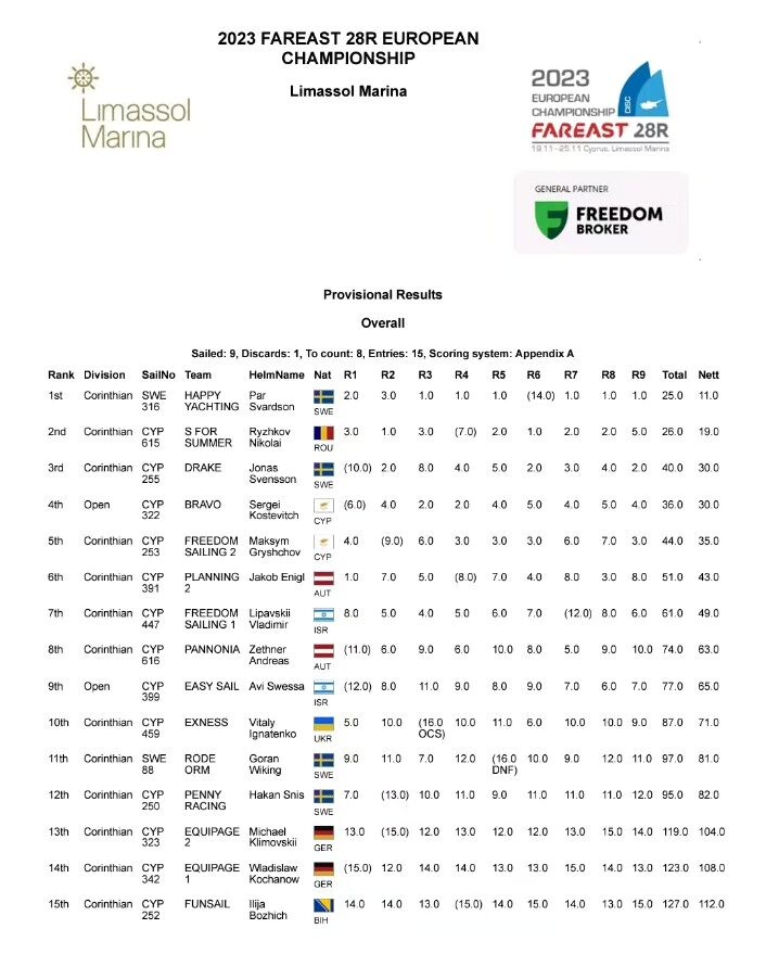 Svenska resultat efter nio seglingar (efter 10 race får två strykas):