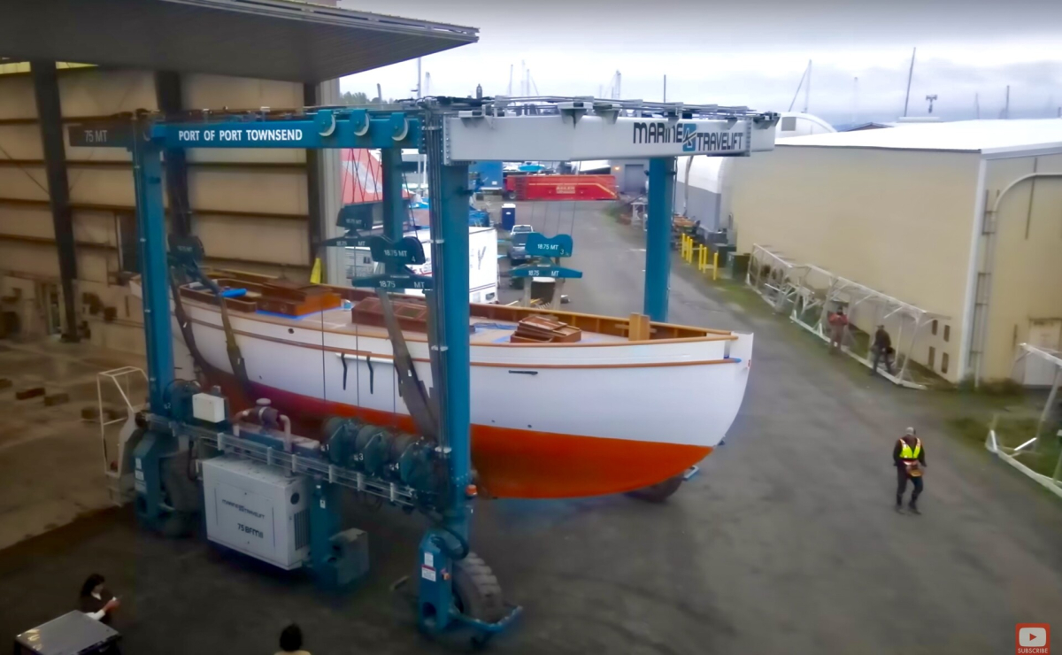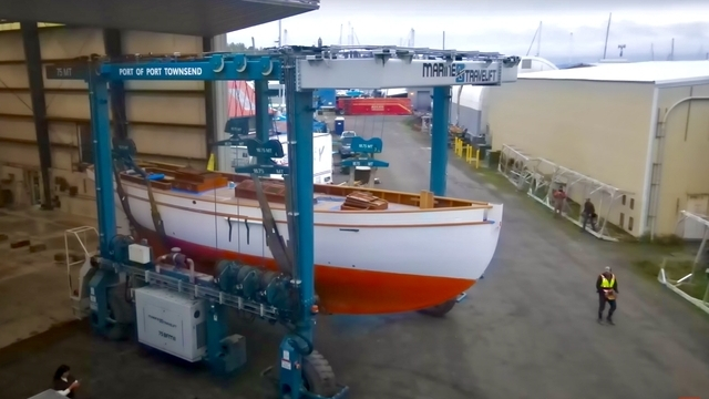 Den gamla restaurerade träbåten Tally Ho flyttas och inväntar sin nya mast.