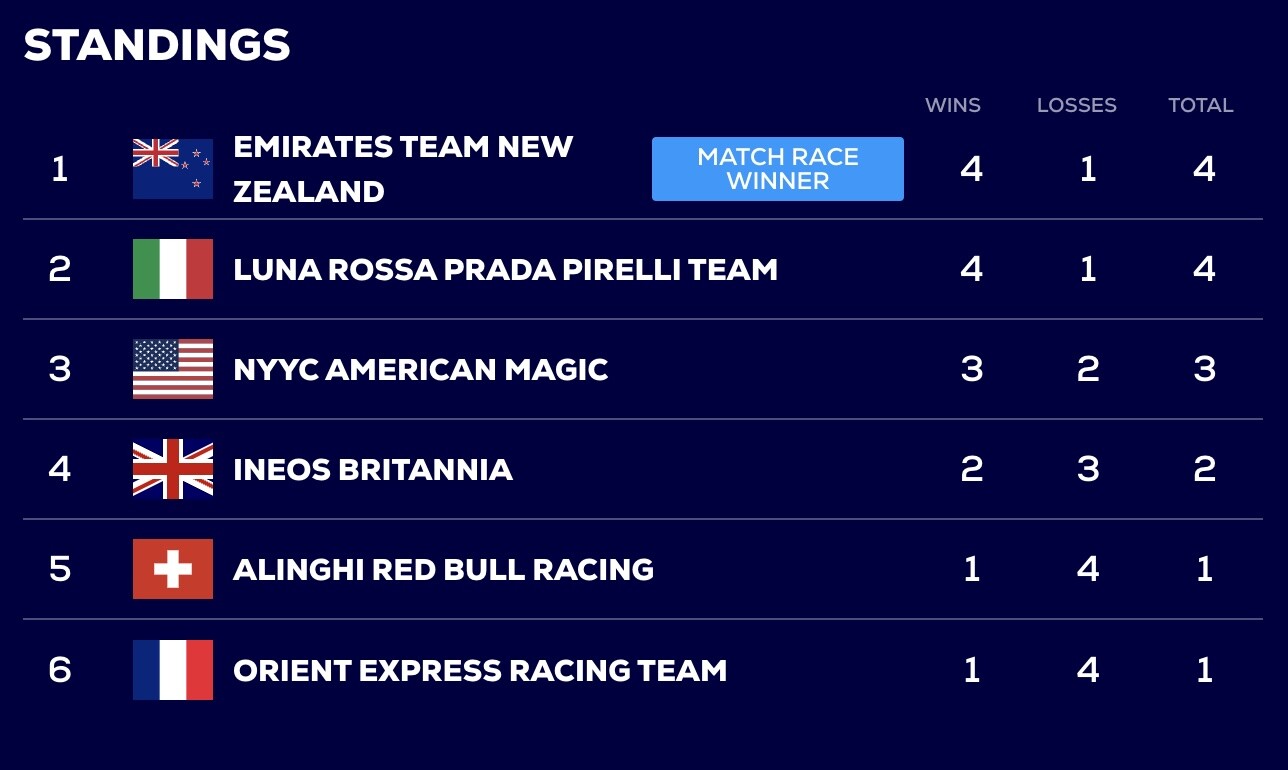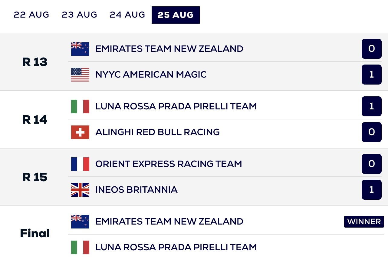 Vi inleder med slutresultatet; med Emirates Team New Zealand i final med Luna Rossa Prada Pirelli Team som nyazeeländarna kniper. På tredje plats slutade NYYC American Magic.