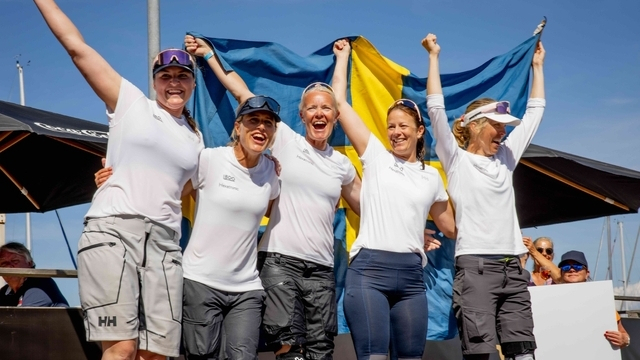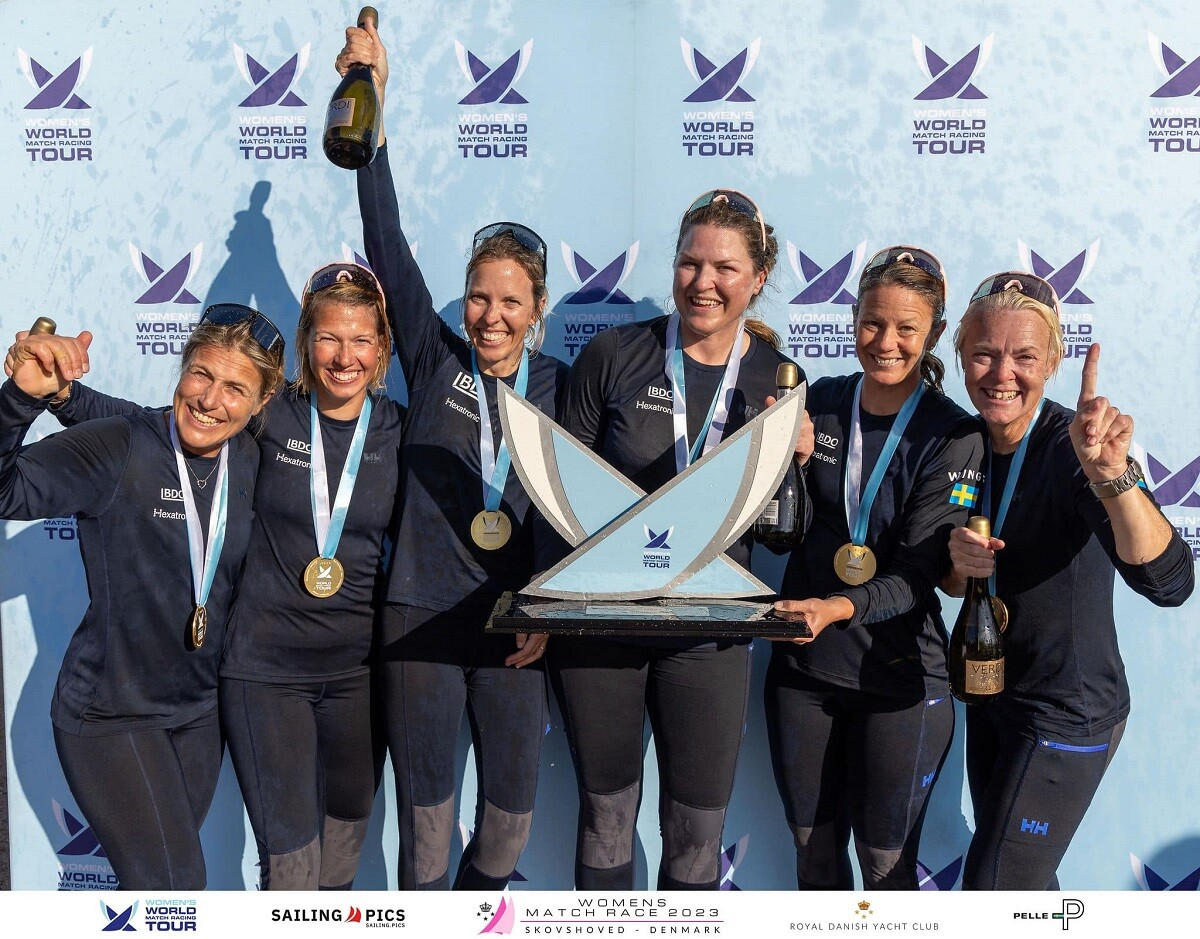 Wings firar vinsten i WMRT 2023. Från vänster; Anna Holmdahl, Marie Grusmark, Anna Östling, Linnea Wennergren, Jenny Axhede, Annika Carlunger. Foto: Sailing.Pics