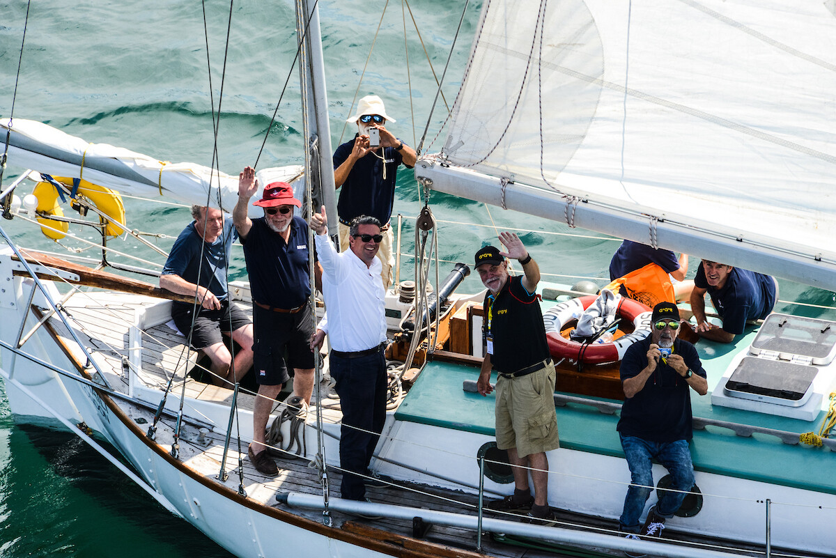 Starten av Golden Globe Race 2018. Sir Robin Knox-Johnston avfyrar startskottet ombord sin legendariska båt Suhaili. Foto: Nick Jaffe / GGR2018