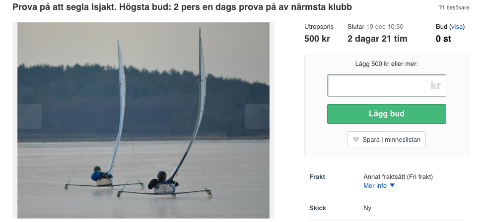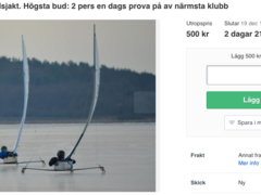 "Prova adrenalinkicken av att segla galet fort på is. Högsta bud får tillfälle att segla 2 personer en dag med istruktörer från närmsta klubb. [...] Svenska DN-isjaktsällskapet, DN Sweden. Världens snabbaste internationella seglingsklass!"