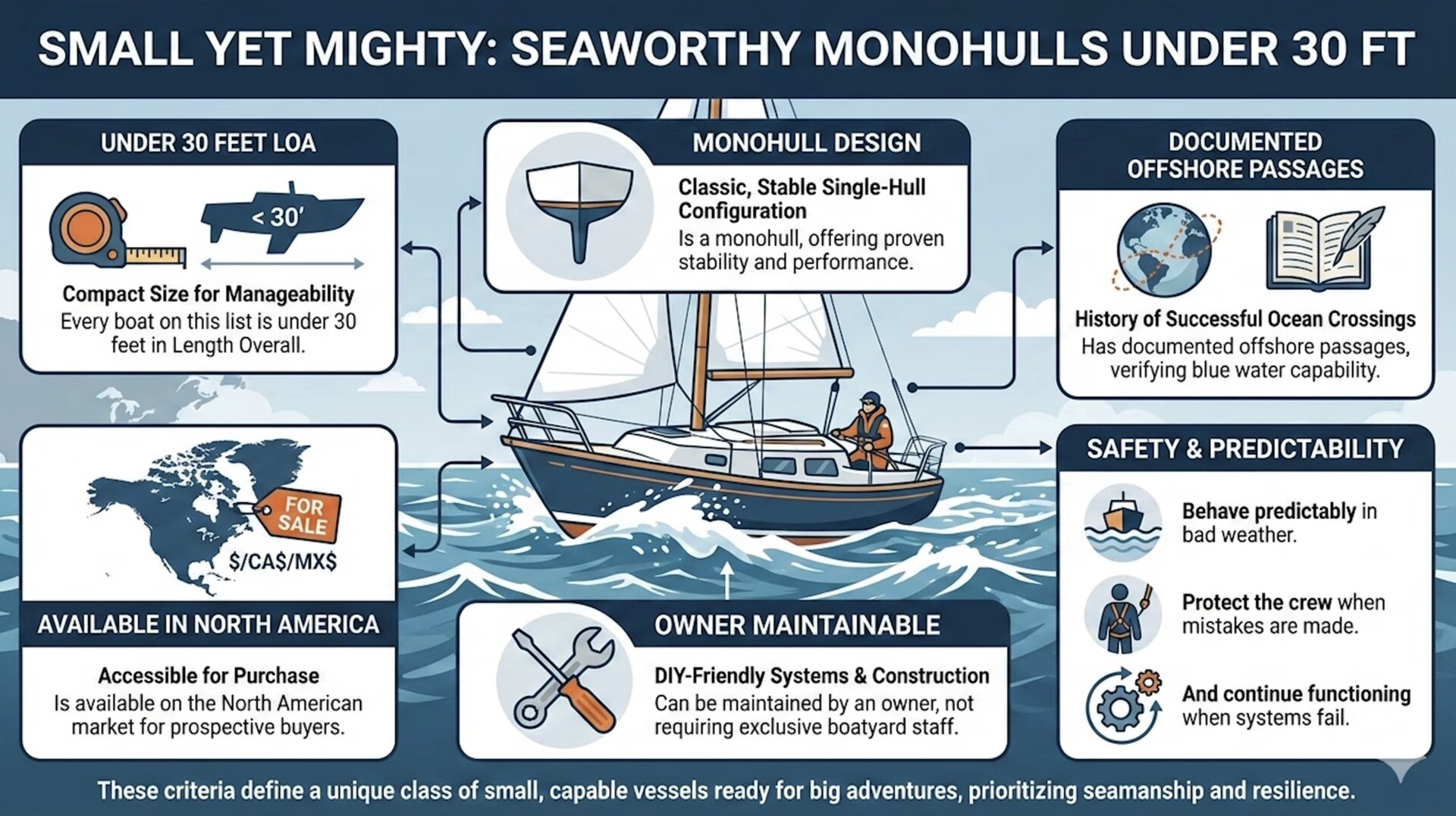 Kan man verkligen segla jorden runt i en liten segelbåt? Absolut. Det finns till och med de seglare som föredrar smått framför stort. Nyfiken på mer? Nedan bjuder Old Boat Sailor* på en ofiltrerad introduktion till långsegling med mindre segelbåt och en lista över sjöduglia modeller. Vi ser med glädje att ikoniska Albin Vega tagit sig in på listan.