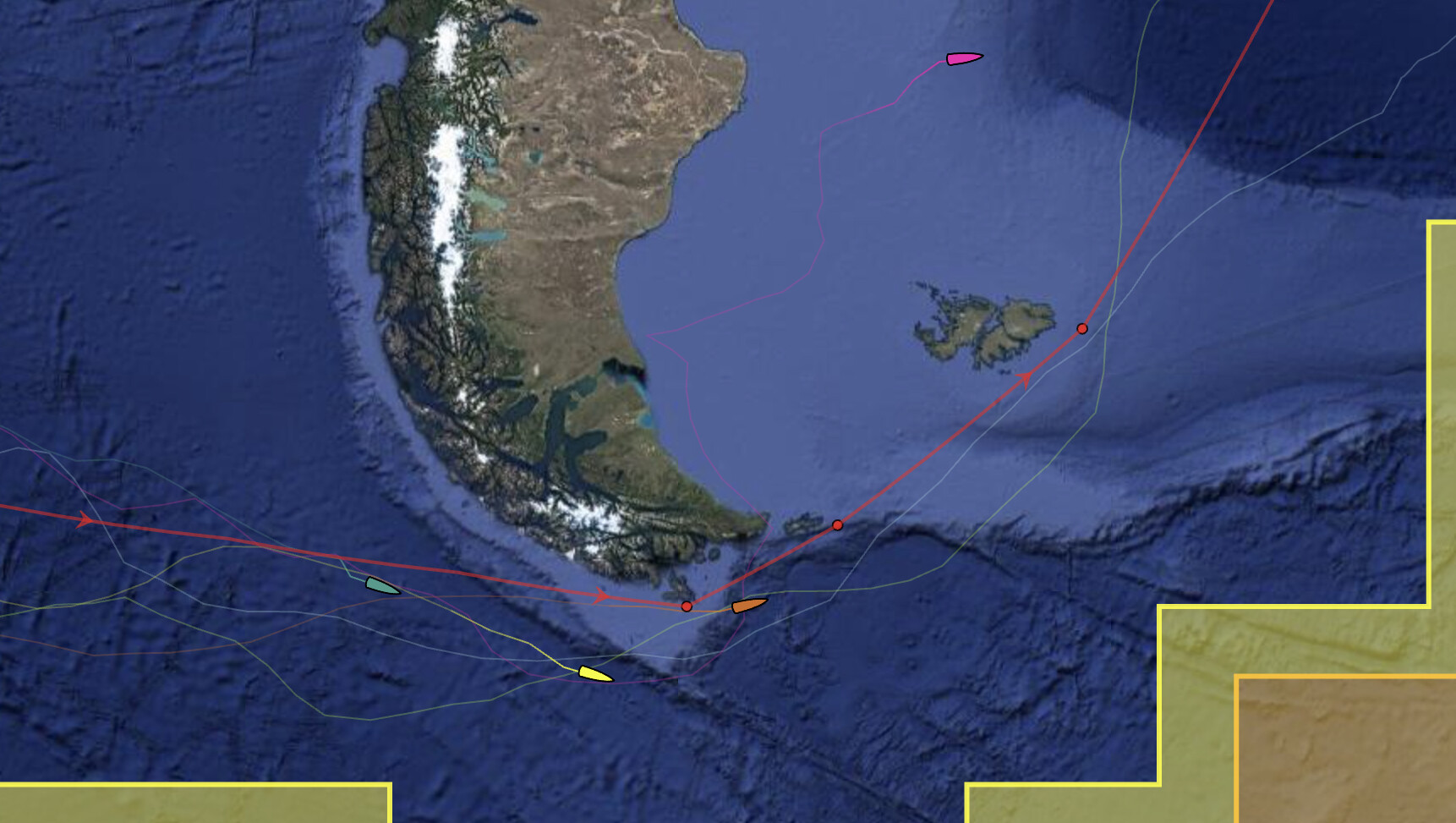 Därtill kommer deltagaran i Global Solo Challenge. Italienaren Andrea Mura (orange båt) passerade Kap Horn på morgonen den 7 februari. Gul och grön båt, Francois Gouin respektive Riccardo Tosetto, står näst på tur.