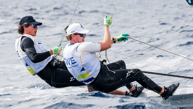 Fotografiet ovan visar Marius Westerlind och Olle Aronsson på VM i 49er 2025.