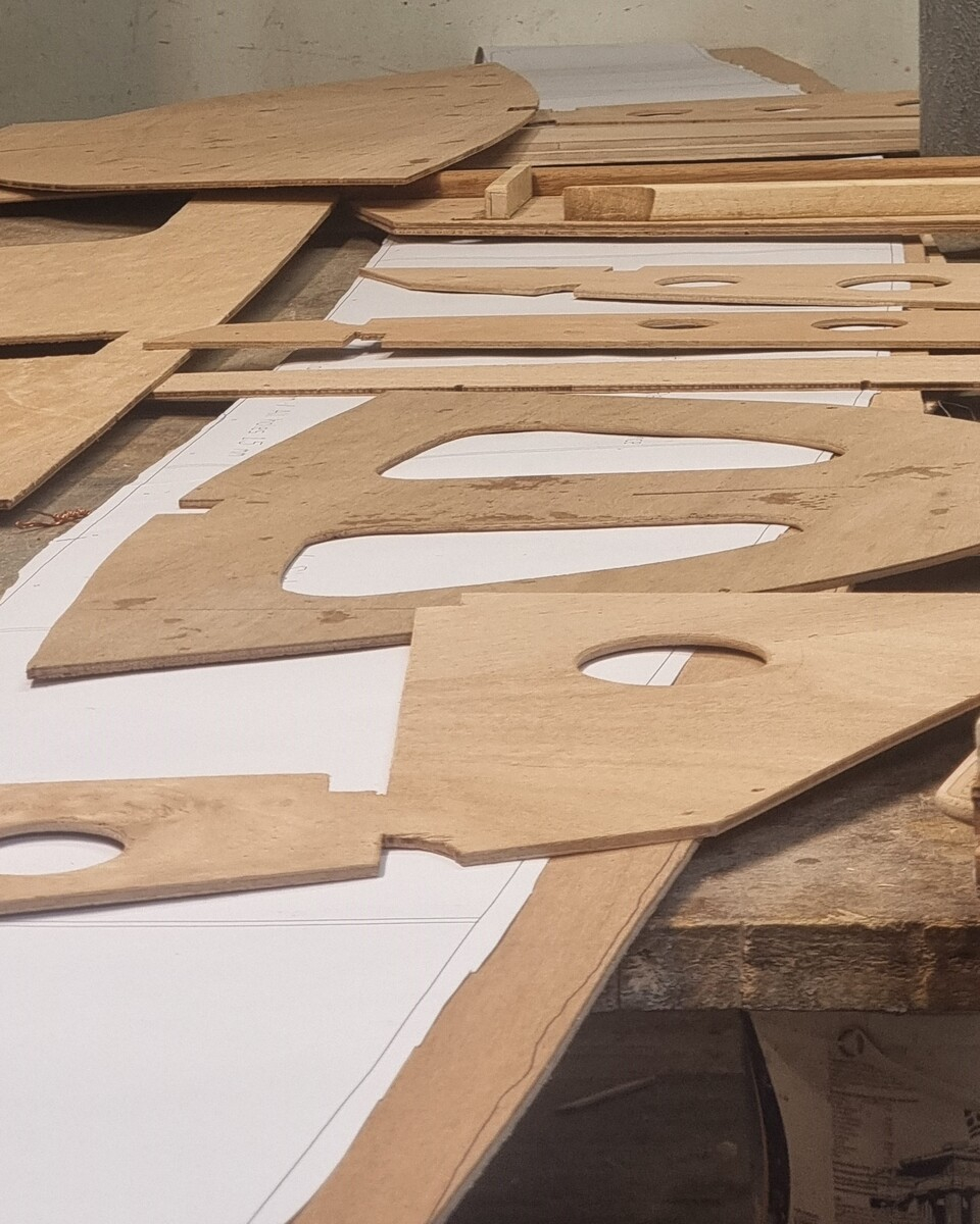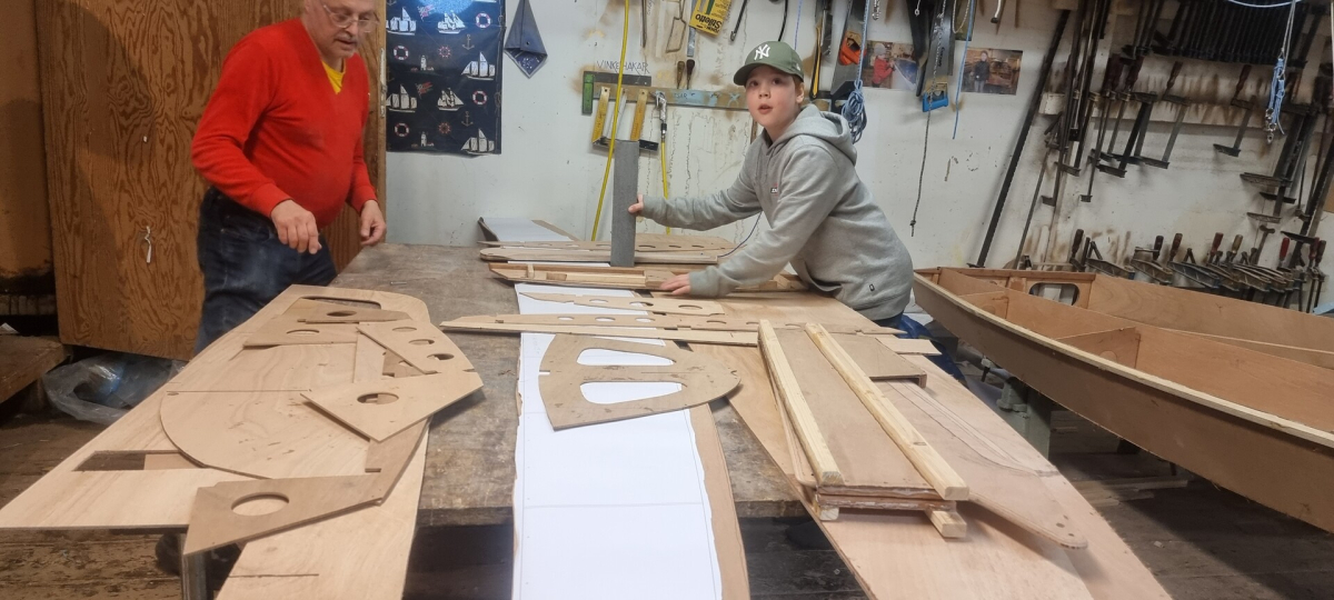 Nisse och Alfred. Bitarna kommer snart sättas ihop med koppartråd och utgöra grunden till skrovet. De är uppmätta, utsågade och slipade av Alfred.