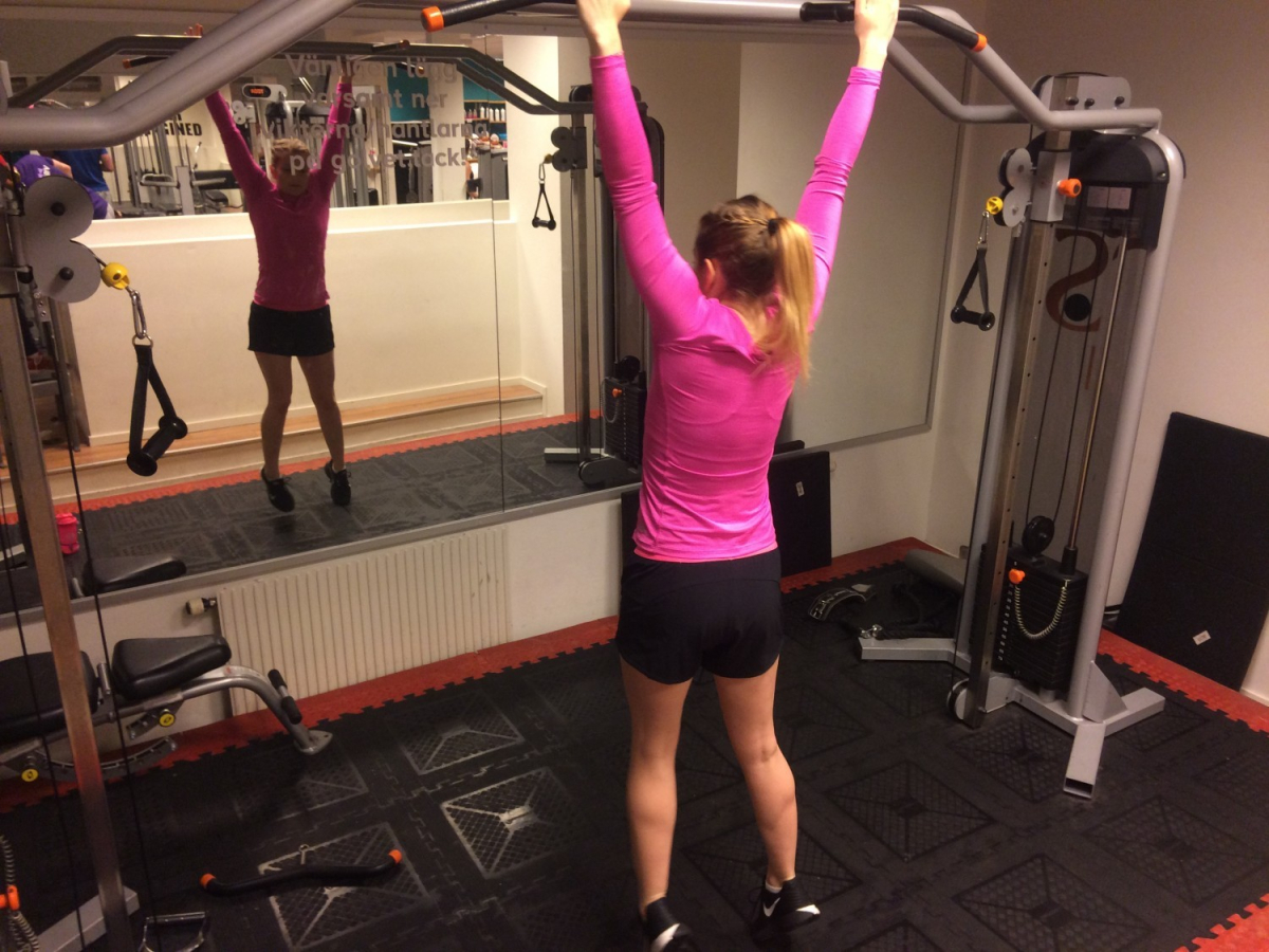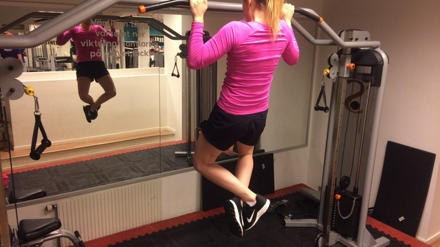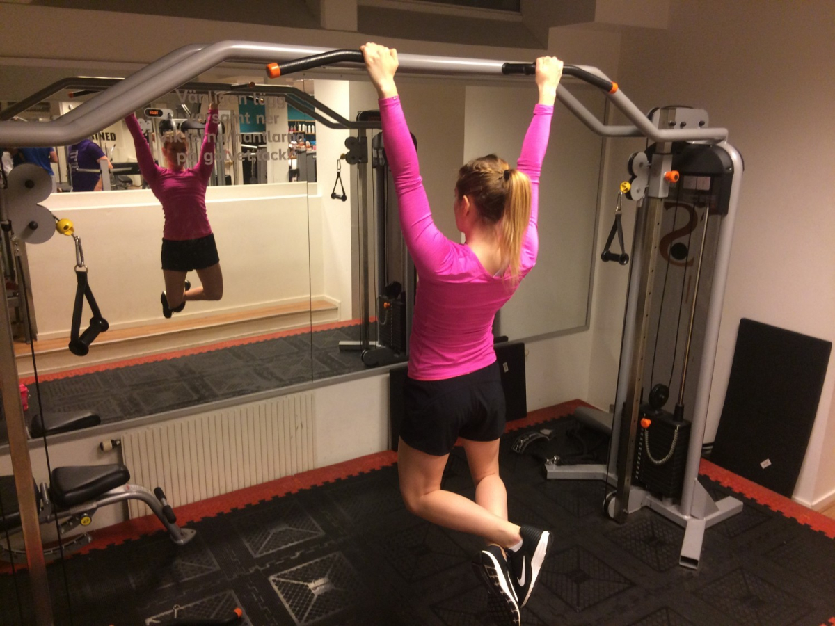 Sen är det dags att börja dra sig upp. Det är tugnt i början, innan man lärt sig och fått in styrkan, så använd gärna ett gummiband som fästs uppe vid stången och dras runt ditt knä. Tänk på att båda sidorna ska dra lika mycket, så titta gärna i en spegel så inte den starkare sidan drar mer. Brösta gärna upp dig också, och tänk på att det är bröstet som ska upp mot stången. När du väl klarat en utan hjälp, kommer det snabbt att ticka uppåt!