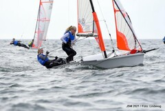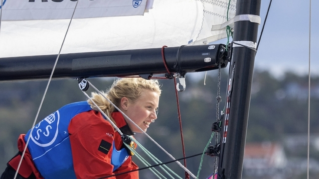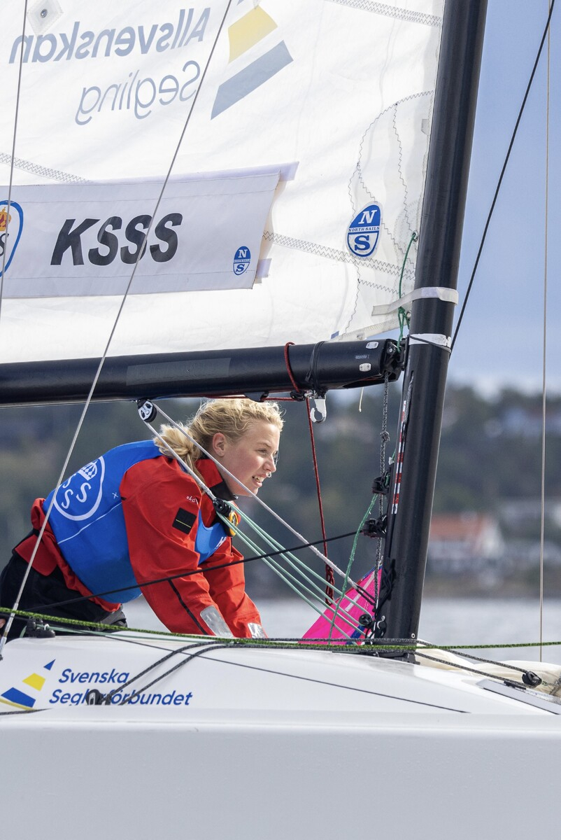 Maxine har hunnit segla många båtar i sin karriär. Här i en 29er under JSM 2021 Foto: Mårten Lindskog