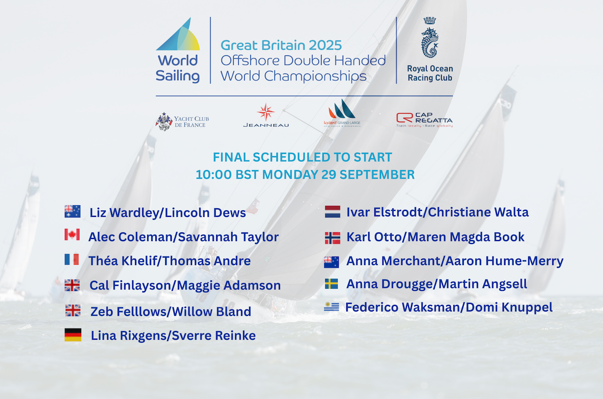 Finalflottan består av 11 båtar. Vi kan inte låta bli att notera Liz Wardley som seglar tillsammans med Lincoln Dews för Australien. Liz var fördäckare på svenska Team SCA under Volvo Ocean Race 2024-15. Efter att de senaste åren spenderat extremt mycket tid vid årorna är det kul att se henne tillbaka på kappseglingsbanan igen. Du följer hela härligheten via sailracehq.com.