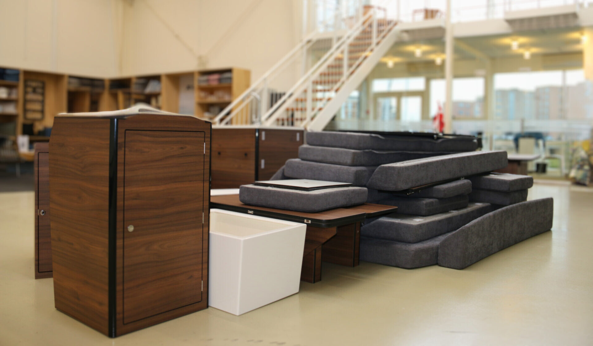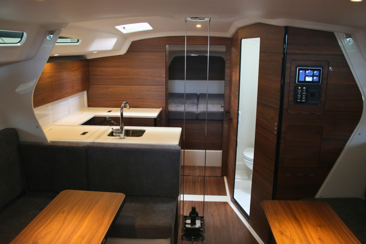Inredningen är modern, robust, stilren och avskalad med fina kontraster mellan ljusa och mörka material – väl anpassad för cruising och enkel att avlägsna vid racing. Bord och soffor i salongen kan lätt lossas och lyftas ur, likaså delar av köket. Resultatet blir en lättare båt med stora praktiska ytor för kappsegling.
