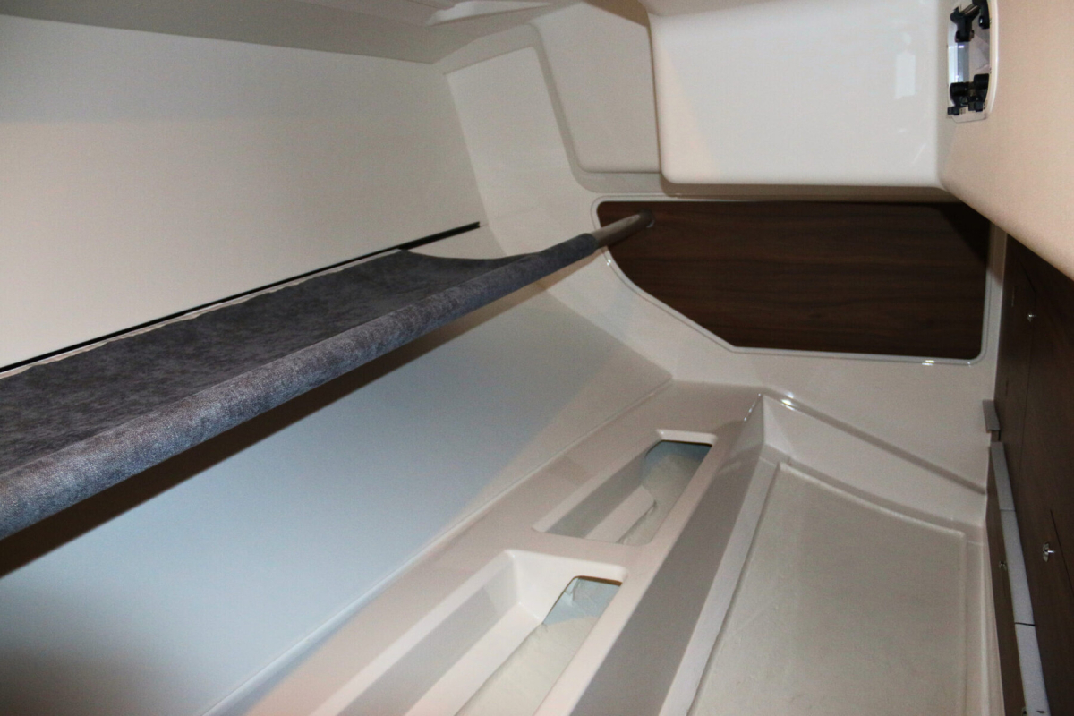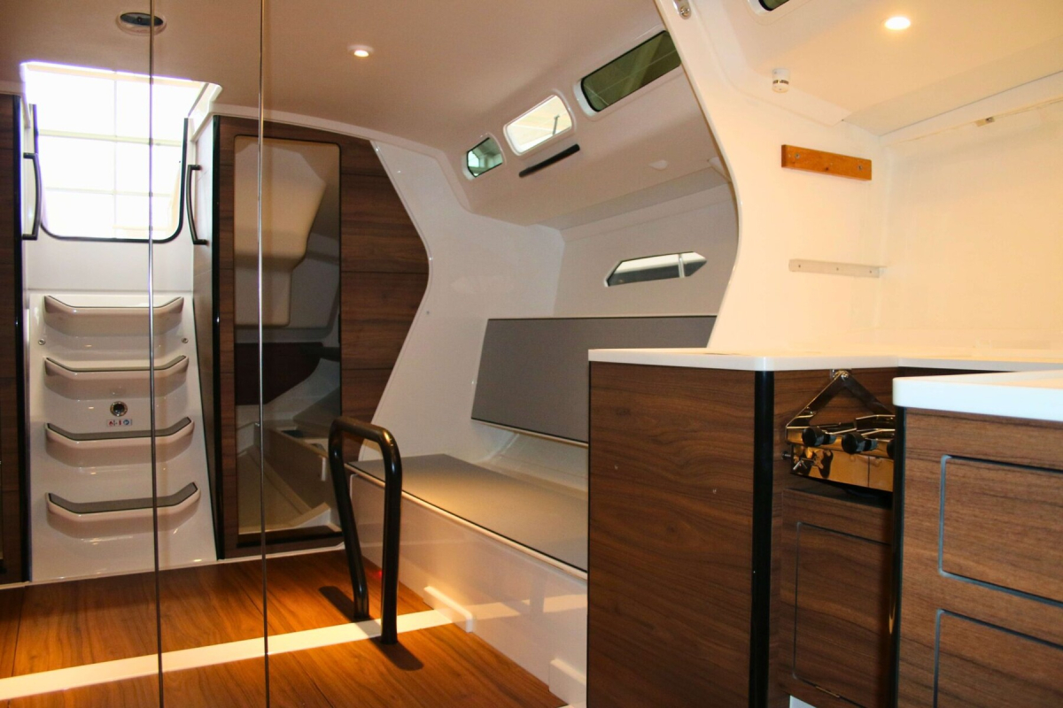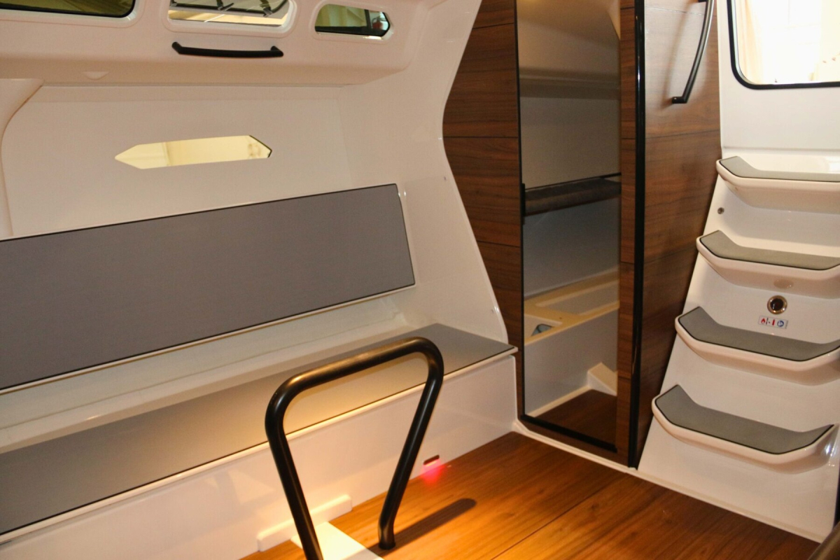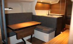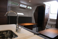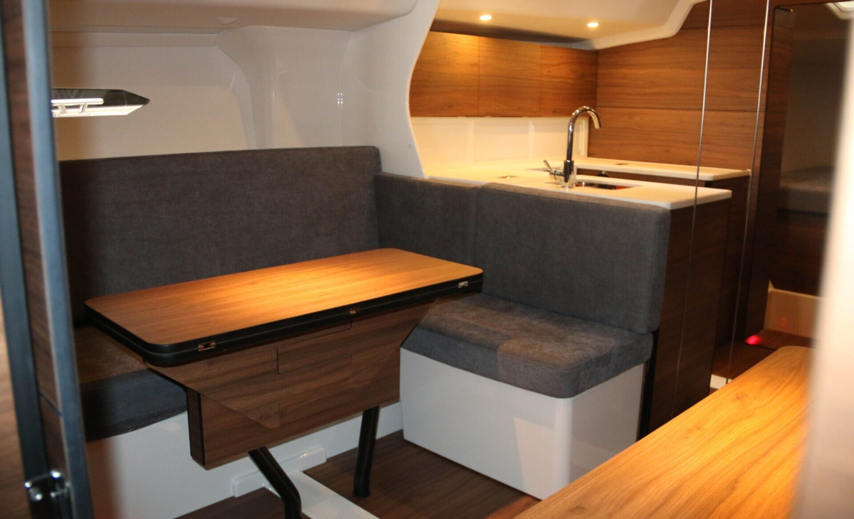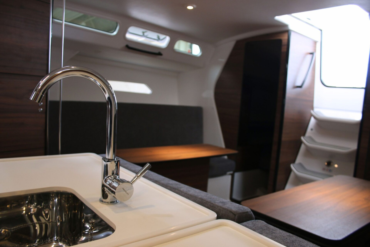 Planlösningen i salongen är öppen och pentryt välutrustat med kylskåp, spis med ugn, diskho och diverse förvaringsutrymmen förutsatt sportutförande. Mitt emot ligger en generöst tilltagen toalett med dusch. Någon traditionell navigationsstation finns inte.