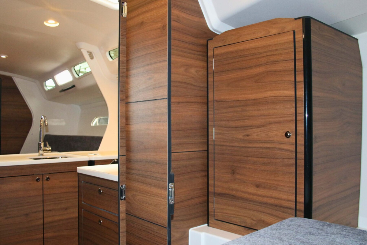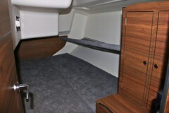 Förpiken är avskild med dubbla dörrar. Den erbjuder ståhöjd, stor koj samt goda möjligheter att förvara personliga tillhörigheter. Precis som i salongen kan delar av möblemanget lätt lossas och lyftas ut. Detsamma gäller för akterhytterna.