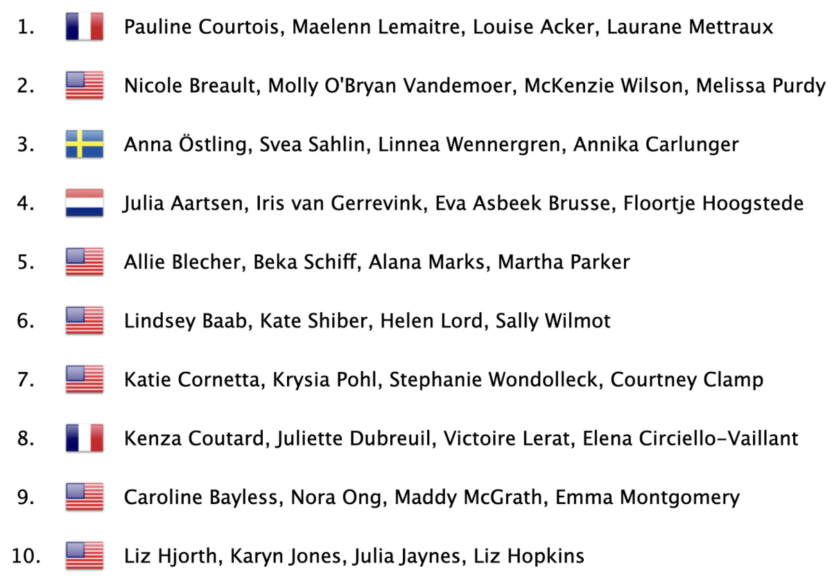 Högst upp på pallen slutade Team Baam (USA) med Allie Blecher vid rodret. Finalen mot Nicole Breaults Vela Racing (USA) avgjordes i lätta vindar och slutade 3-0.