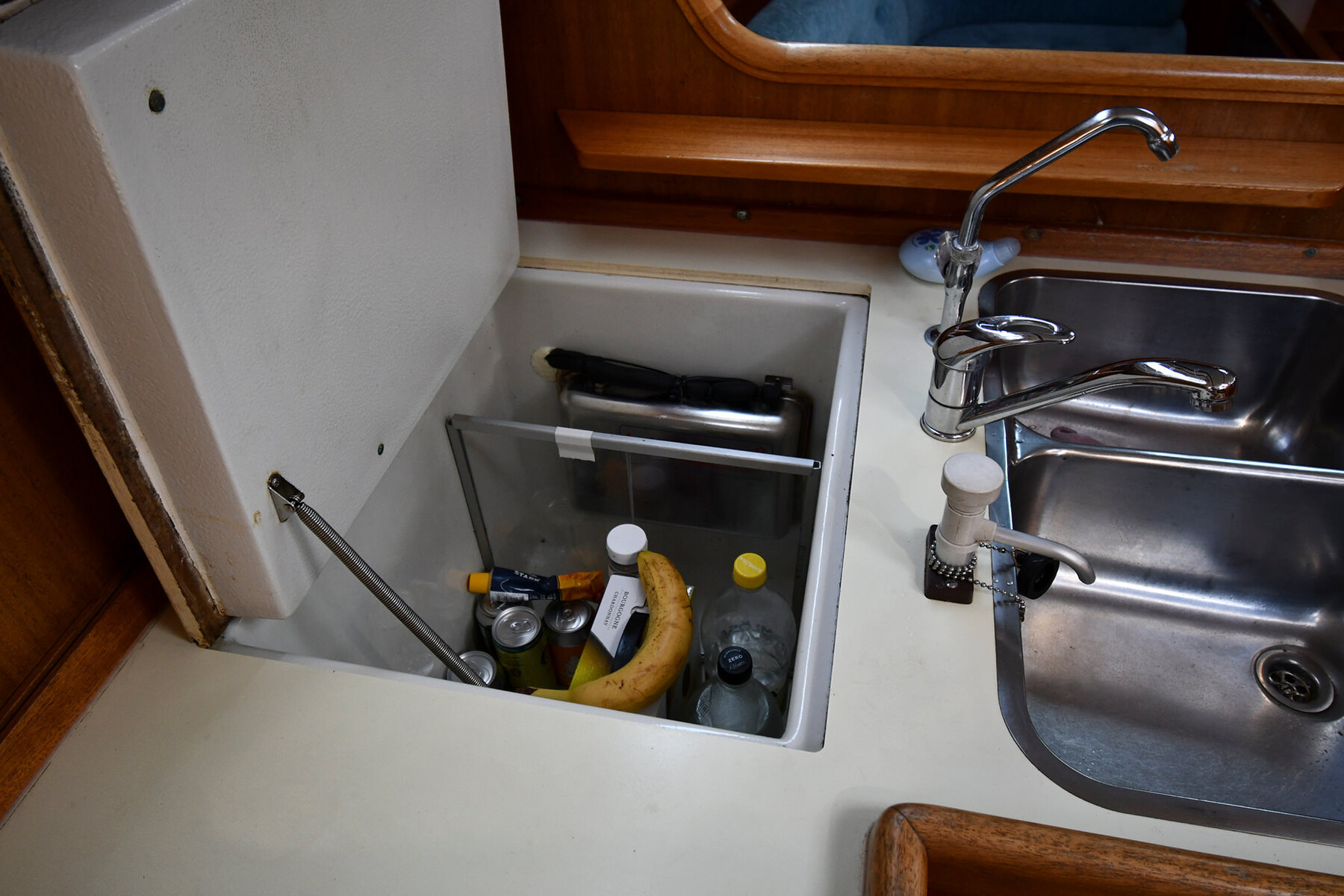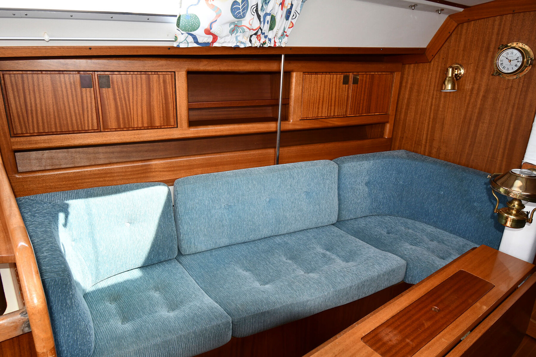 När du kliver ner i båten möts du av en ljus och rymlig salong. På babordssidan finns ett L-format kök med gott om arbetsyta och förvaring, medan styrbordssidan rymmer en praktisk navigationsplats.