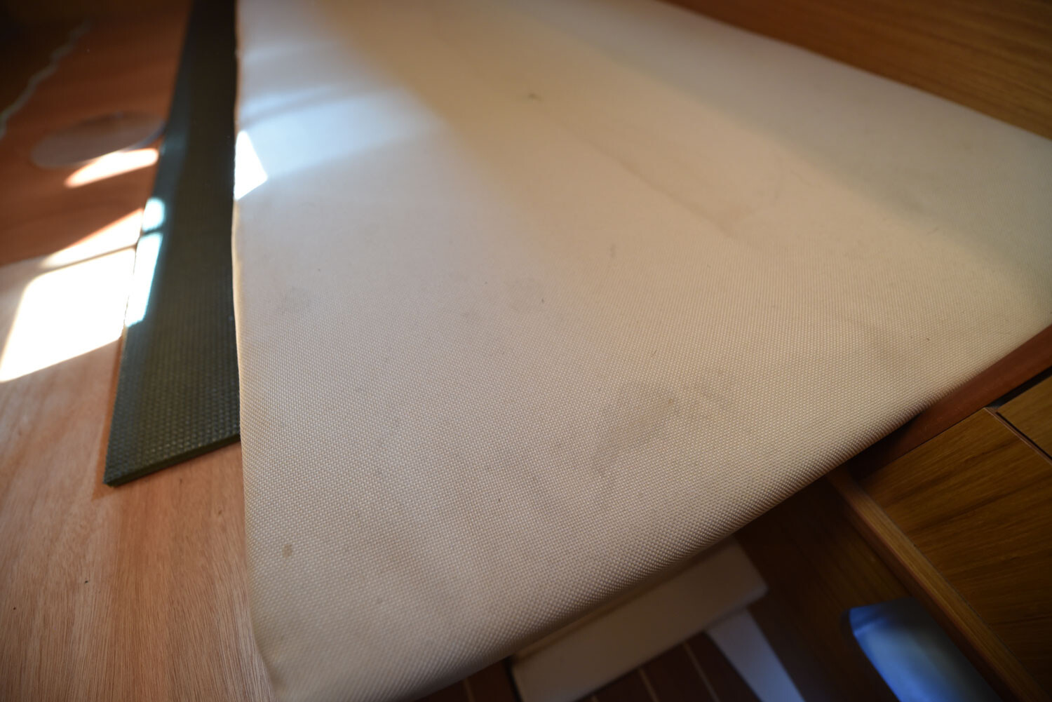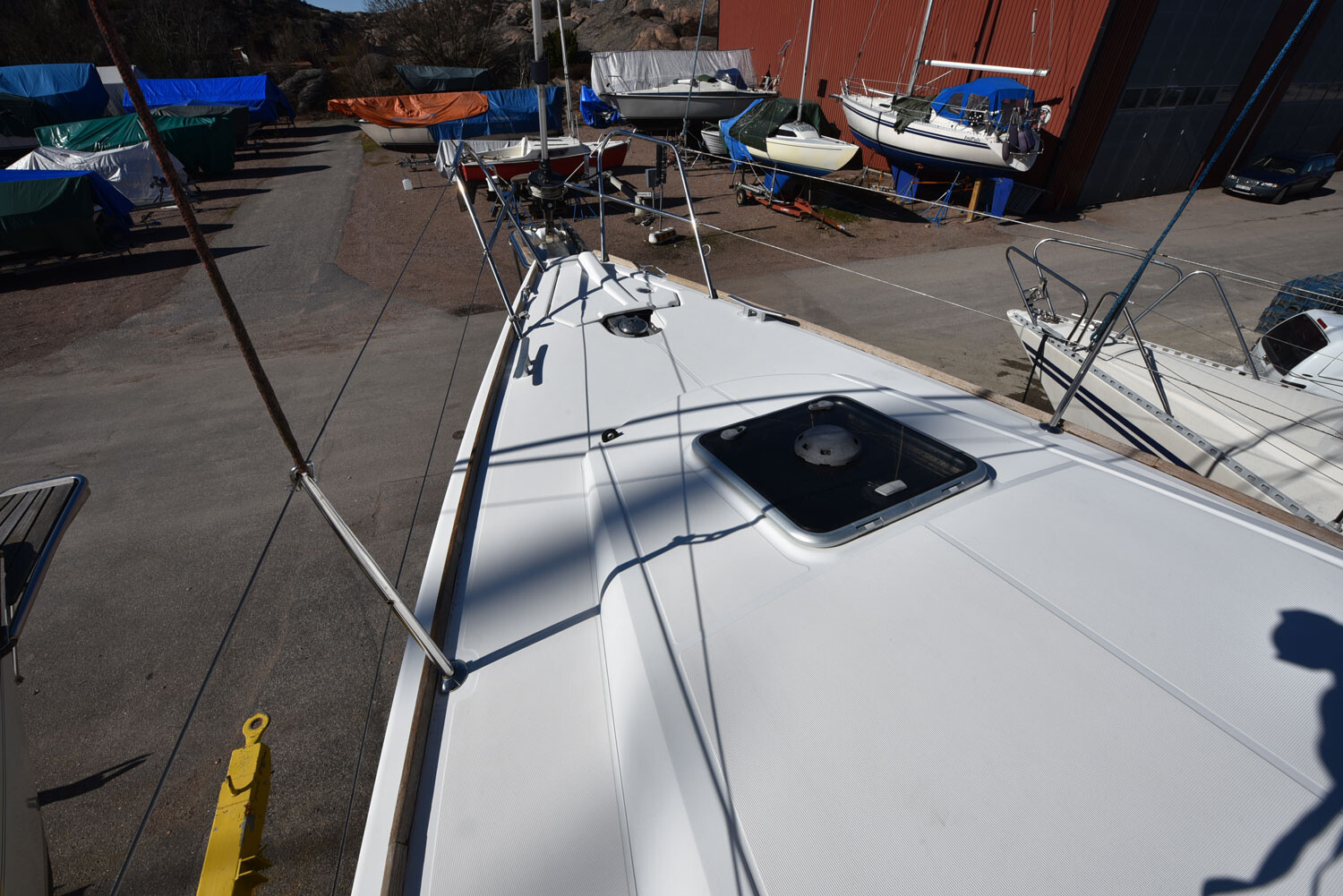 Segelgarderoben består av en 125% genua, storsegel (båda original) samt en lite nyare Code 1 (2016) från Boding. Dyform i stället för traditionell 19-trådig vajer i den stående riggen.