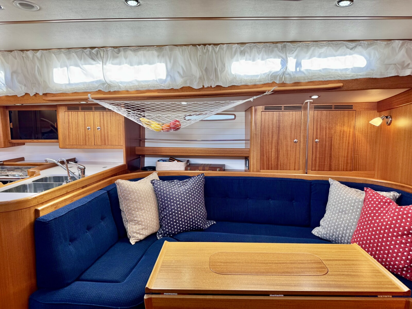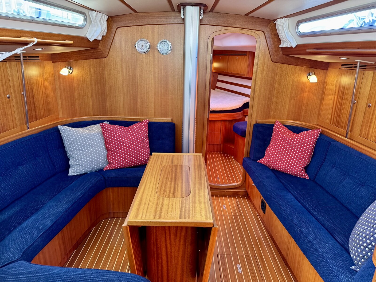 Den rymliga sittbrunnen har plats för hela besättningen, både under segel och vid fest i hamnen. En interiör som uppfyller höga krav på hantverksskicklighet och utnyttjande av båtens alla ... Läs mer